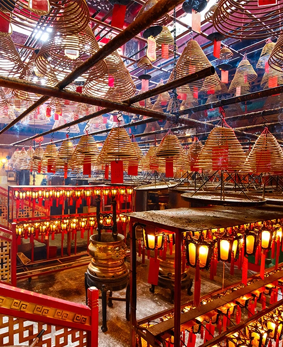 Incense coils burn slowly in Man Mo Temple while financial executives rush past outside. This contrast defines the local identity, preserving spiritual rituals amidst the relentless pace of a global financial hub.